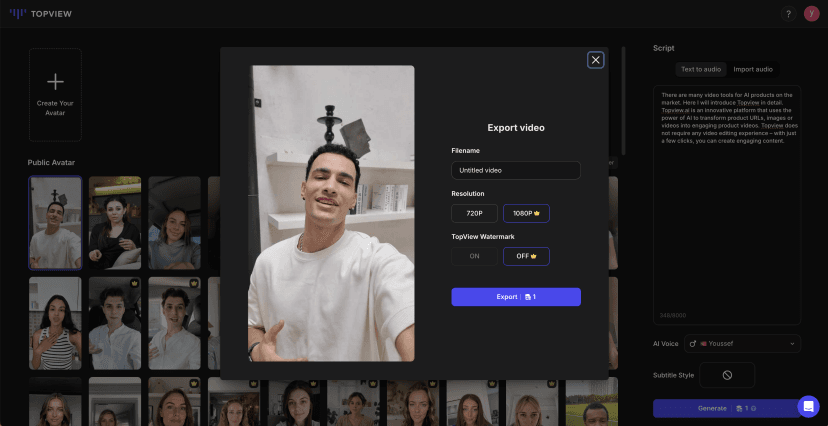 After selecting your avatar, paste your script into the text box. TopView will generate a text-to-speech voiceover for your avatar, ensuring the lip-sync and expressions are natural. You can choose from a variety of languages and tones.